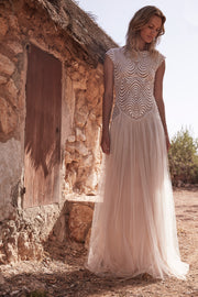 short sleeves and crew neckline. Embroidered tulle top, satin-lined tulle skirt.