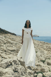 This wedding dress worthy of a Greek goddess showsoff the female figure with its crossover seam detailing and a cinch waistband that gives the dress architectural and vestal lines.